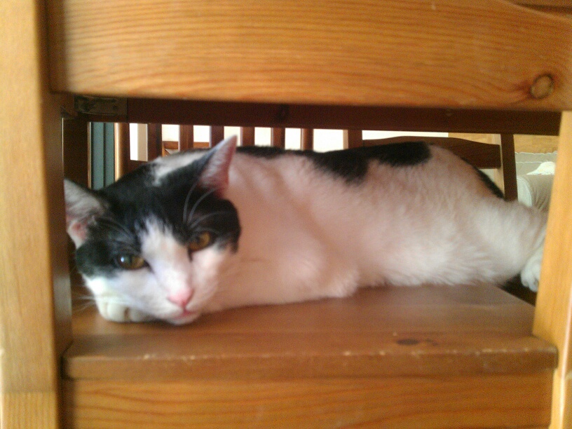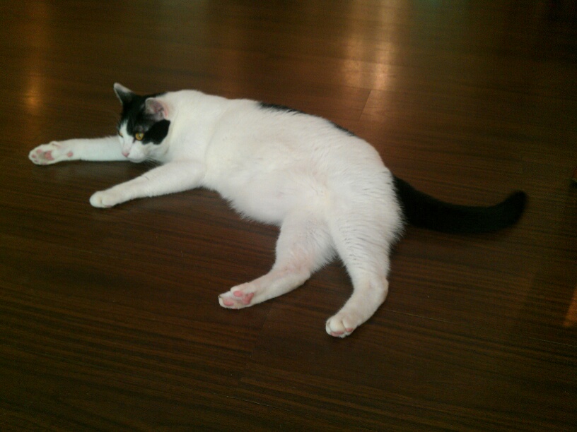 沒什麼人,連我在內就三人,點了菜之後才發現店貓正懶懶地在木板地面上或坐或躺。我走過去和牠打招呼,牠叫牛奶,男生,三歲,體重八公斤,跟我家小六差不多耶。不過牠非常怡然自在,而且還蠻配合地給摸跟拍照~